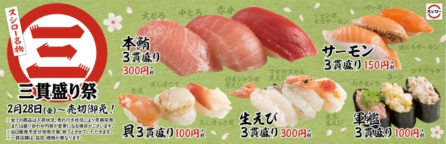 2月28日(金)より、毎回大好評のフェアで、三貫盛り15貫全てのネタをお召し上がりいただいても950円(+税)でお楽しみいただける「三貫盛り祭」を、全国のスシローにて期間限定で開催いたします。