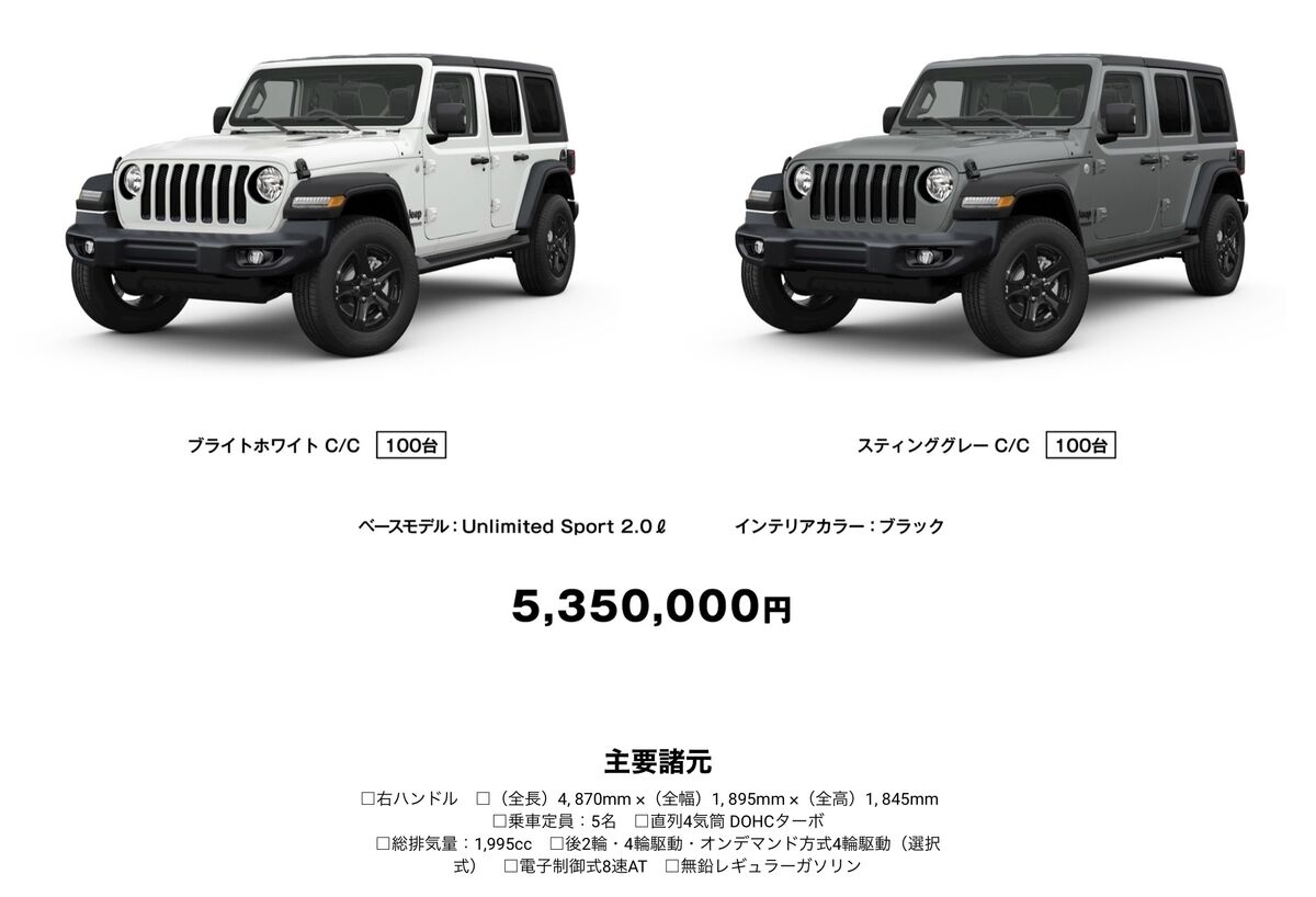 2月26日、FCAジャパンはジープの本格オフローダー「ラングラー」に、内外装をスタイリッシュに演出した限定車「ラングラー・アンリミテッド・スポーツ・アルティテュード」を設定し、3月7日に発売すると発表した。発売台数は限定200台で、税込車両価格は535万円だ。