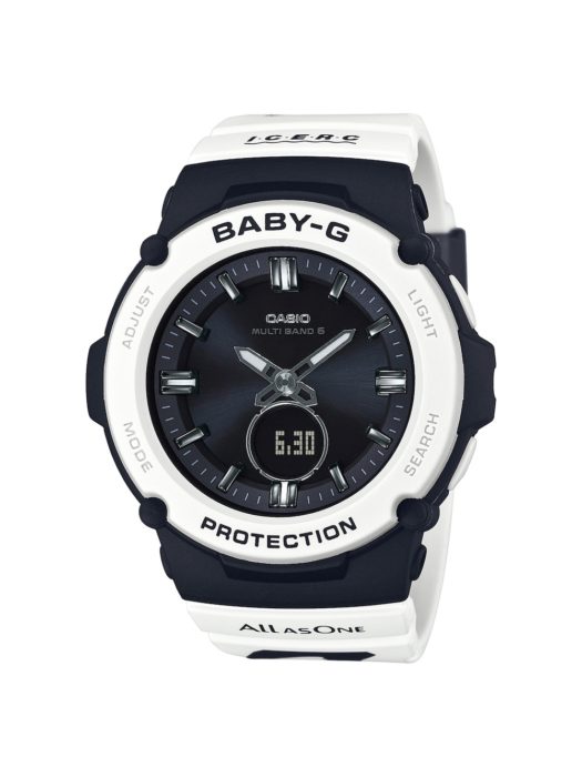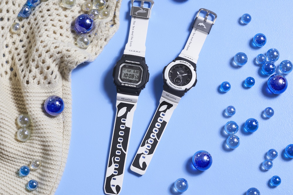 ファミリーの絆が強いとされるオルカ=シャチがモチーフの白黒柄を、G-SHOCKとBABY-Gのバンドへオン。裏蓋にはアイサーチ・ジャパンが掲げるLove The Sea And The Earthのシンボルを刻印した。クジラとイルカのシルエットもそれぞれの遊環に。