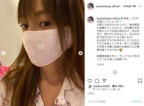 4. 深田恭子、久々のインスタ更新で“母お手製”のマスク姿 「とっても素敵」「恭子ちゃんに