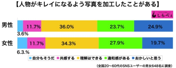 しらべぇ編集部が全国の20~60代のSNSユーザーの男女648名を対象に、アプリなどを使った「写真加工」について調査を実施したところ、「自分もそうだ」「共感する」「理解はできる」を合わせた写真加工肯定派の割合は全体で51.8%にも及んだ。