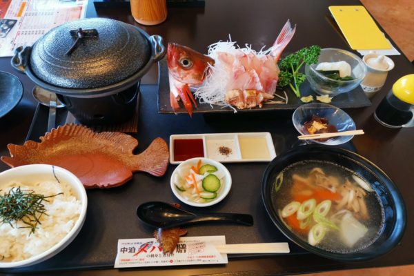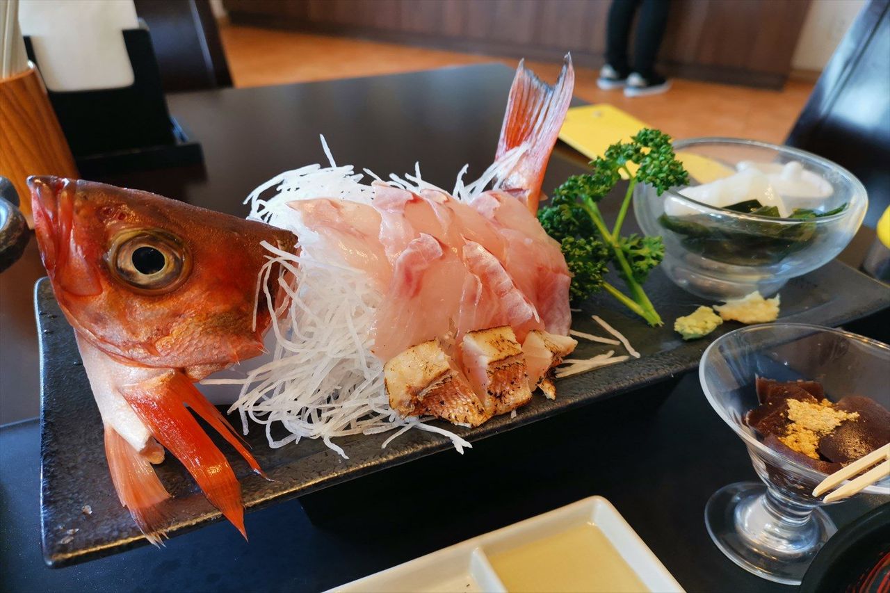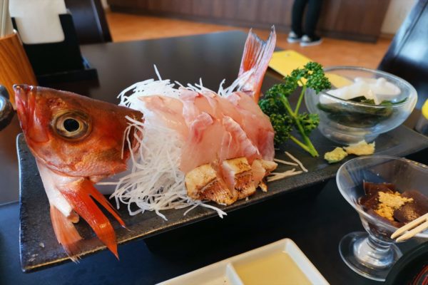 す、すごい豪華さ! 刺身姿盛りに煮魚、潮汁にデザート、ご飯とメバルが全方位で楽しめるお膳ではないか! これなら1,800円でもお値打ち感がある。