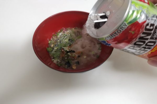 ストロングゼロが冷たいのでみそが溶けづらいかな? と思ったが、炭酸の効果だろうかすんなりと溶かすことができた。