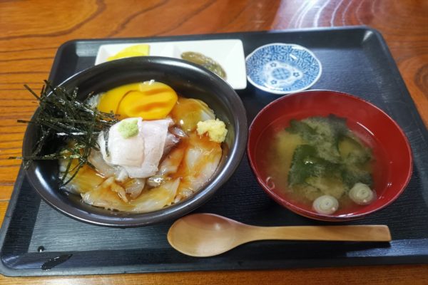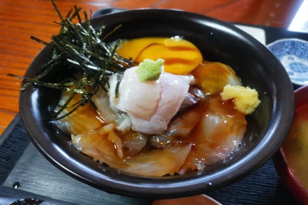 鯵ヶ沢産のヒラメをたっぷり使った『ヒラメの漬け丼』。記者はトッピングにおススメの生卵とえんがわをつけて注文し、合計1,350円。