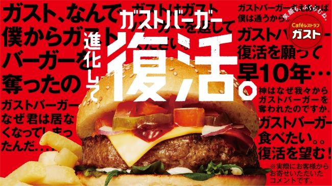 「ガストバーガー」はかつて販売され、復活を望む声が多かったという商品。このたび、ビーフ100%使用の、約170gのボリュームパティへと進化して、2012年以来7年ぶりの復活。